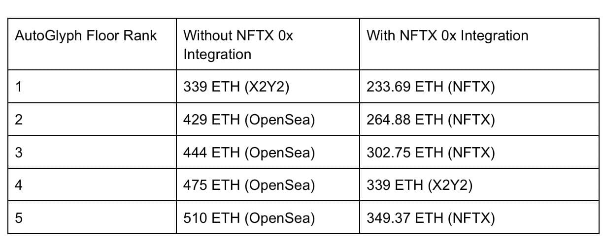 The table shows the increasing cost on NFTX if each AutoGlyph was purchased in separate transactions. If you were to buy four Glyphs in a single transaction from NFTX, it would cost you 1150.69 ETH at an average cost of 287.67 ETH per AutoGlyph. If you only wanted a random item from the vault, you could bring that down to 1,122.46 ETH and just 280 ETH per AutoGlyph.