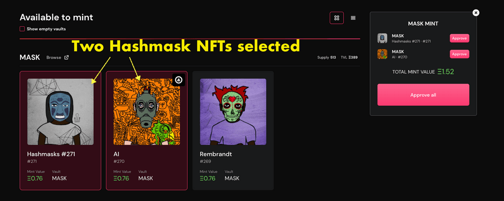 Select one or more NFTs to mint to a particular vault. In this instance, Hashmask #271 and #270 have been selected.