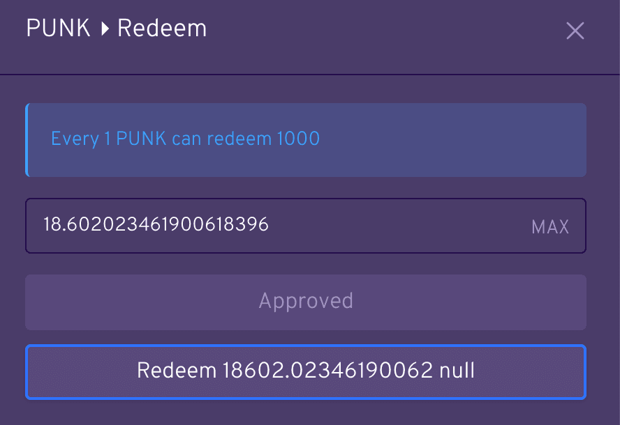 Click on Approve and redeem, and in return for ever 1 PUNK you will receive 1000 PUNK-CORE.